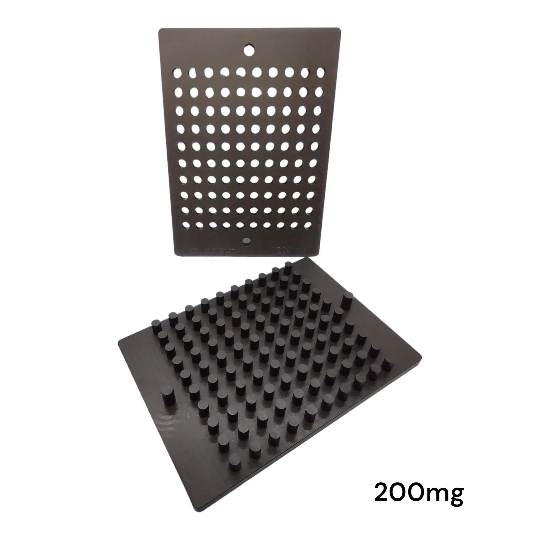 Two-piece 100 cavity molds are designed for compounding tablet triturates or troches. Each mold consists of a base plate with alignment pegs and a top plate with corresponding holes. To make tablets, place the top plate on a Glass Pill Tile or Ointment Slab then fill the holes evenly with the tablet paste using a hard rubber spatula to compress the mixture. When the paste has hardened, slide mold off edge of slab, align the top plate alignment holes (left and right side) over the base plate alignment pegs (left and right side) and press down to punch out tablets from top plate. Allow to dry/harden.